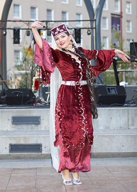 The dances of the Caucasus generally are characterized by beautiful hand and arm movements and often by tiny gliding steps, which, under a floor-length skirt, evoke the illusion that the dancer is floating over the floor. These traditional dances -- sometimes melancholy, sometimes fiery -- are always lyrical and graceful, full of eye contact and smiles and express the natural pride of Caucasian women.